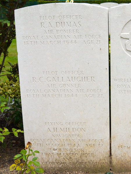 Richard Alexandre Dumas, son of Clayton W. Dumas and H. Audrey Dumas, from St. Anne de Bellevue, Province of Quebec, Canada. Pilot Officer, bomb aimer Handley Page Halifax HX279 ZL-Z RCAF 427 “Lion” Squadron.