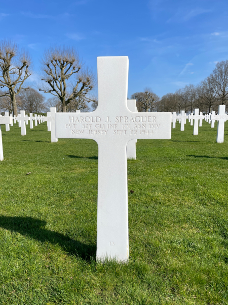 Harold Junior Spraguer. Private HQ Company 327th Glider Infantry Regiment. Son of Roy Clyde Spraguer (1891-1947) and Martha M. ‘Nan’ Sellers Spraguer (1894-1992). He attended Hackensack High School and worked at Maywood Chemical Works. He enlisted on 5 December 1942 in Newark, New Jersey. Harold Spraguer was killed in action on 22 September 1944 during Operation Market Garden in the Netherlands.
