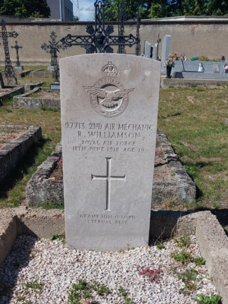 Richard Williamson, Air Mechanic 2nd Class, 52nd Squadron RAF. Son of Richard Williamson of Stringers Hill, Pytchley, Kettering. Killed in action at the age of 19 on 18 June 1918 and buried in the Municipal Cemetery of Moulins-Sur-Allier. The inscription on the gravestone reads: “GRANT HIM O LORD ETERNAL REST”.