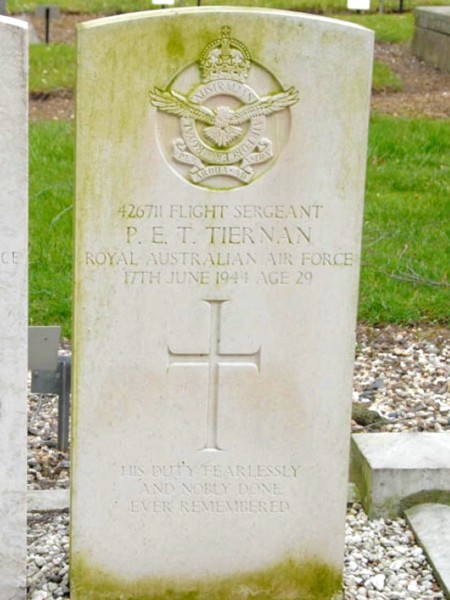 Patrick Tiernan, son of James and Mary Tiernan from Murgon, Queensland, Australia. Served as Flight Sergeant, air gunner with No. 77 Squadron, Royal Air Force.